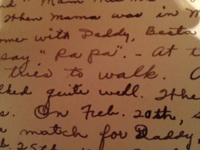 At 8 ½ months I was saying “da da” and then “daddy.” Then I started to say “Papa.” At 10 ½ months I walked quite well. On Feb 20th, 1944, I blew out a match for Daddy who had lit a cigarette. On Feb 25th I tipped a pail of molasses on the floor.
